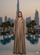 De viral dubai abaya van de kleur taupe. De abaya schikt over drukknopen in het midden en bedrukking aan de voor en achterkant.