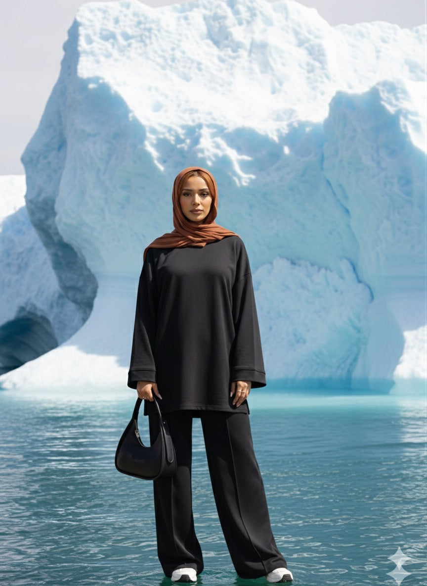 schikt over een broek met wijde pijpen. Rekt goed mee tot een een maat 42.