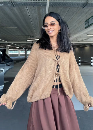 Ribbel wijde jurk met korte v hals bruin