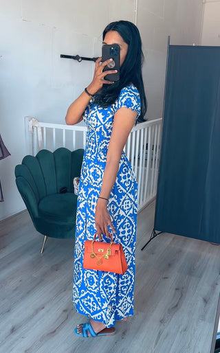 Rekbare lange jurk met printjes blauw wit