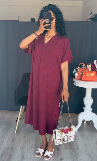 Ribbel wijde jurk met korte v hals burgundy